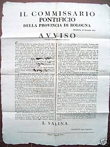 “IL COMMISSARIO PONTIFICIO DELLA PROVINCIA DI BOLOGNA. AVVISO”: manifesto originale datato Bologna 23 settembre 1815, di cm. 59 x 44, fatto stampare dal Commissario L. SALINA dalla Tipografia Sassi.