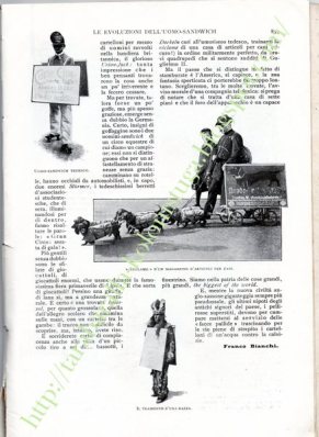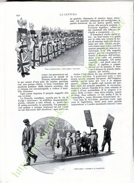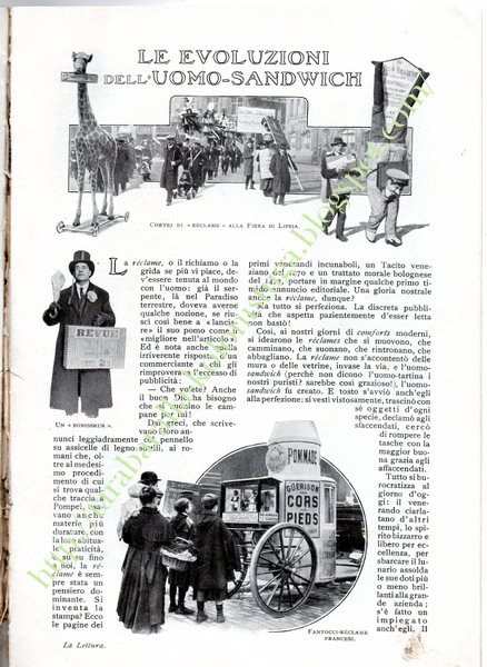 […] Ma per trovate, talora forse un po’ goffe, ma più spesso graziose, emerge senza dubbio la Germania. Certo, insigni di goffagine sono i due uomini-sandwich di un circo equestre di cui diamo un campione; essi non si distinguono che per un affastellamento di stranezze senza grazia: camminano su rotelle, hanno occhiali da automobilisti, e, in capo, due enormi Stürmer, i tedeschissimi berretti d’associazioni studentesche, che di sera, illuminandosi per di dentro, fanno risaltare le parole: “Gran Circo: serata di gala!”. […]