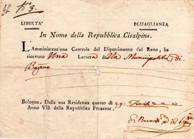 In questo raro documento, splendido per la sua importanza storica, spiccano le iscrizioni: LIBERTA’ E EGUAGLIANZA, parole utilizzate nell’Età Napoleonica (19 giugno 1796 – 8 maggio 1814), IN NOME DELLA REPUBBLICA CISALPINA, repubblica nata il 9 luglio 1797 con capitale Milano, l’AMMINISTRAZIONE DEL DIPARTIMENTO DEL RENO, facenti parte della Repubblica Cispadana(Bologna, Ferrara, Modena e Reggio), proclamata il 27 dicembre 1796 con capitale Bologna; La Repubblica Cispadana fu il primo stato italiano ad adottare il tricolore come bandiera nazionale.