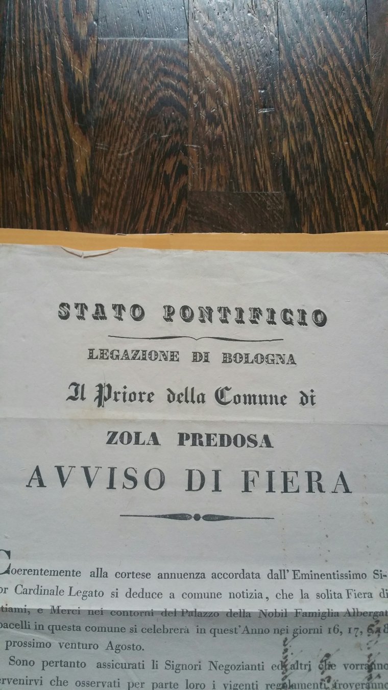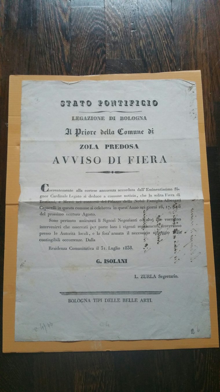 AVVISO DI FIERA – STATO PONTIFICIO- ZOLA PREDOSA 1838